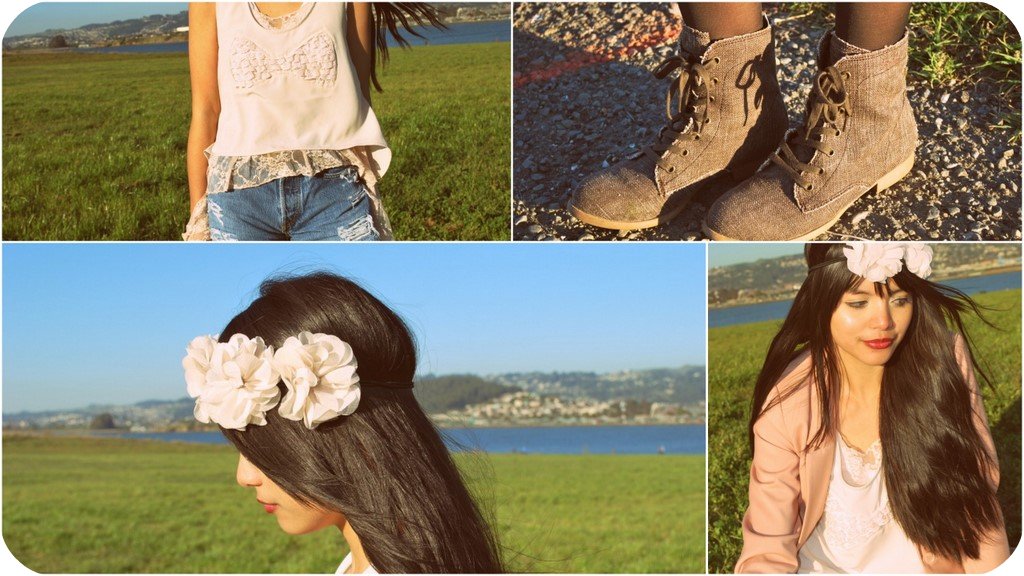 Light pink Urban Outfitters floral headband, Light pink H&M bow cropped top, Blue Urban Outfitters high-waisted shorts, Light pink Forever 21 lace undershirt, Brown Blowfish Java boots.